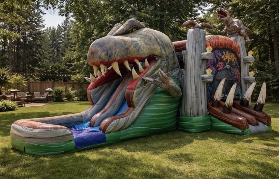 Choose this unit when you want a complete party solution. The Dinosaur Combo combines the excitement of a bouncy house with the thrill of a slide. It complements other services like foam parties and water slide rental to create layered entertainment. Our bounce house rentals are cleaned, inspected, and staffed by professional installers for a worry‑free event.