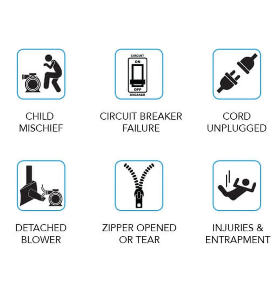 The WATCHDOG™ Blower-Siren uses a patented smart chip that automatically detects if the blower is shut off, loses power, or if the inflatable suffers sudden air loss. If it detects a problem, it sounds its 100+ decibel siren! This gives you precious time to help get children out safely.