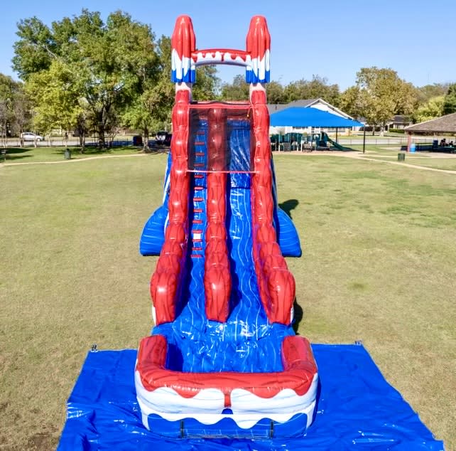 Transform any event into a splash-filled adventure with the Bomb Pop Waterslide! Perfect for all ages, this 20-foot single lane waterslide combines thrilling speed with eye-catching design, bringing smiles to both kids and adults alike. Whether it's a backyard party, a school event, or a corporate gathering, the Bomb Pop Waterslide is guaranteed to be the centerpiece of fun. ๐๐